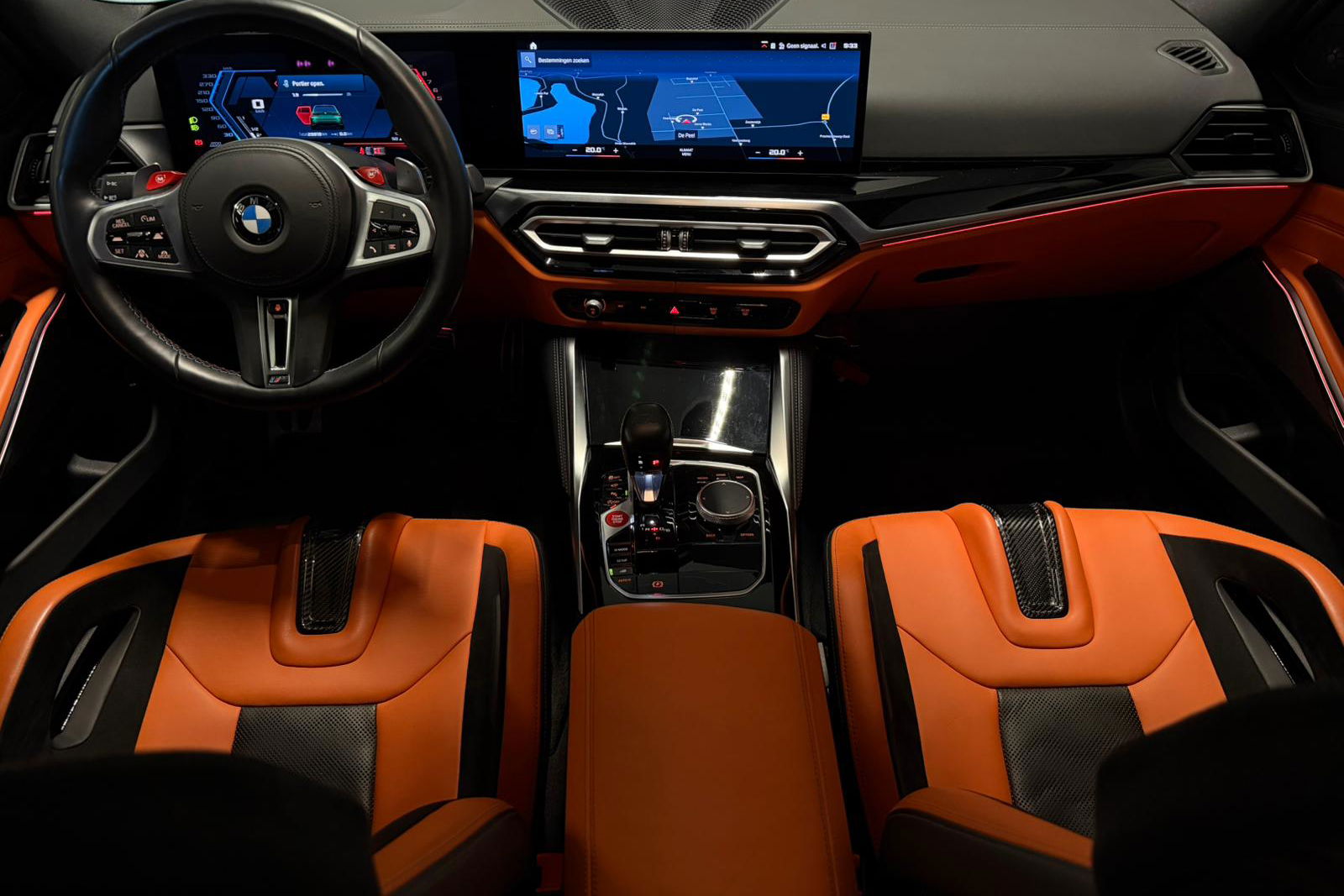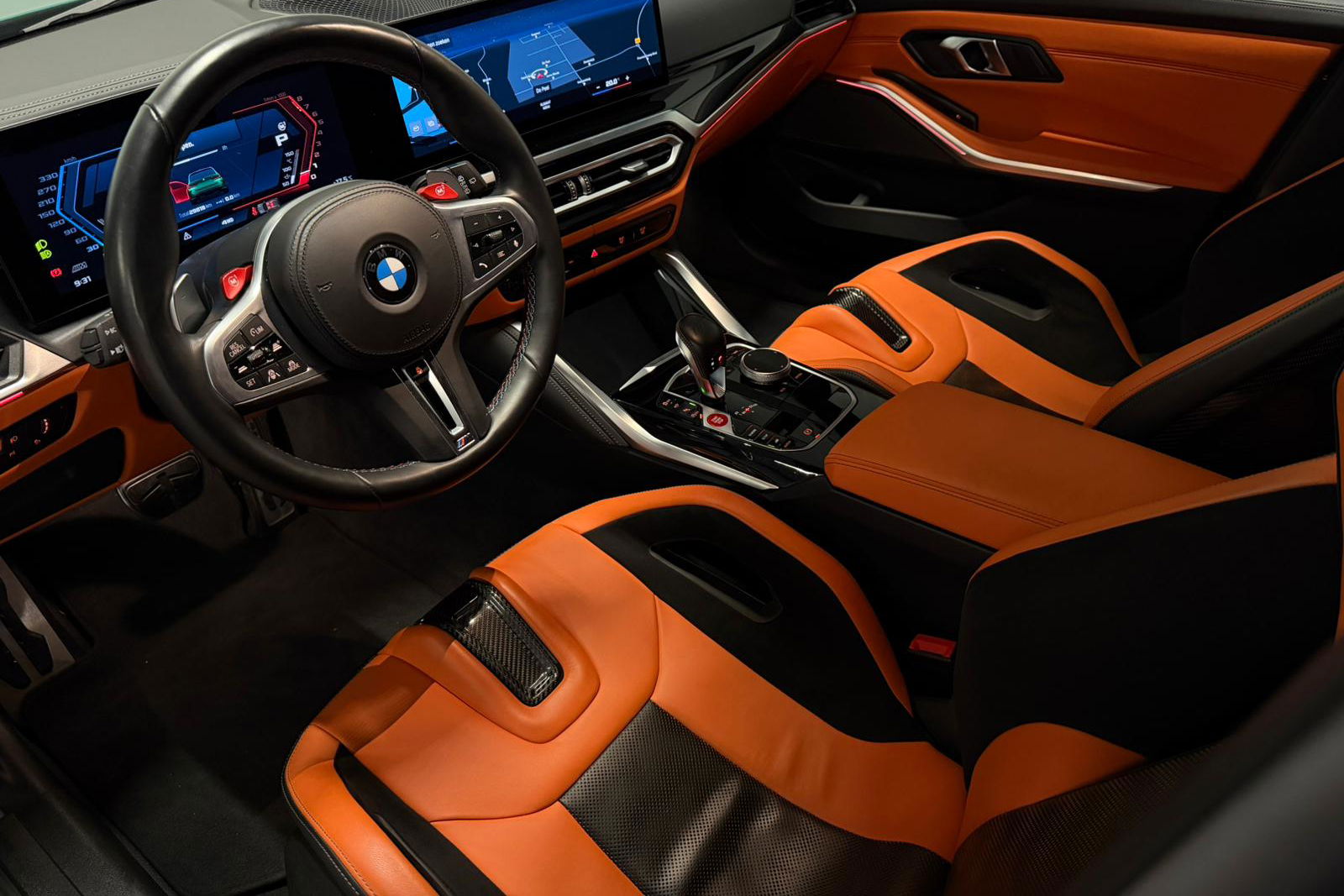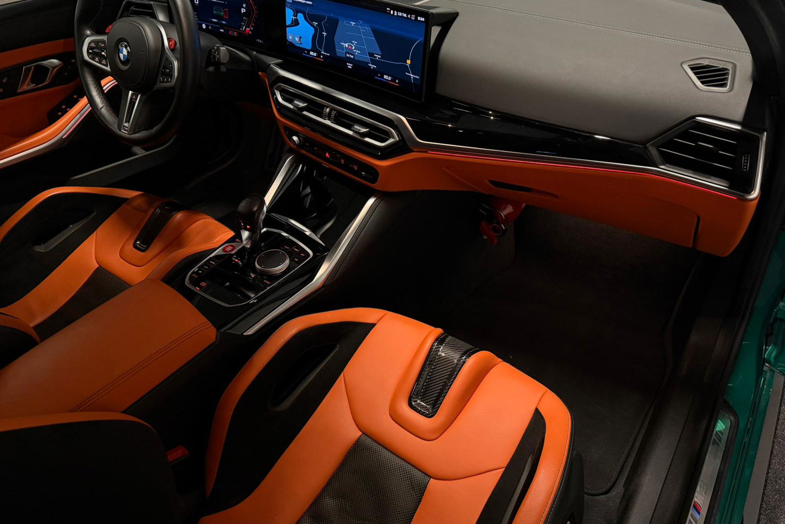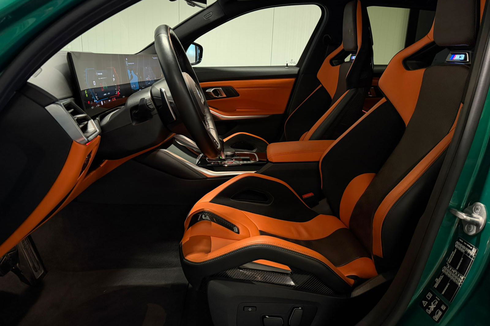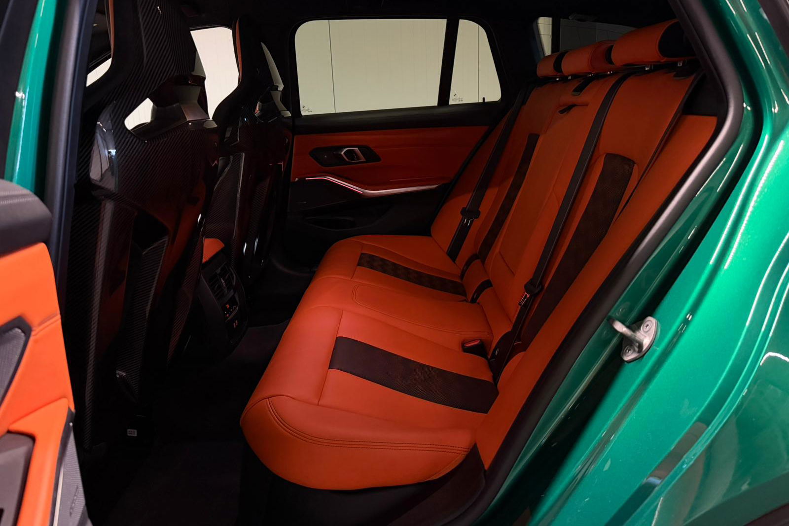 Wat een exemplaar! Deze BMW M3 Touring is uitgevoerd in Isle of Man Green Metallic in combinatie met het lederen interieur Fijnnappa Merino Kyalami oranje zwart met M Logo’s verlicht.