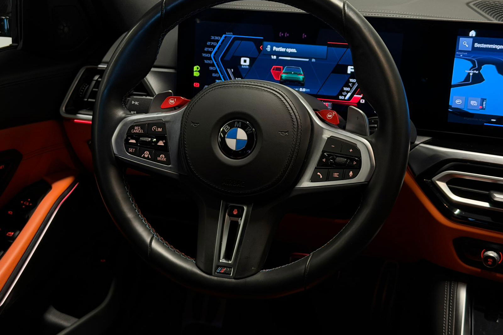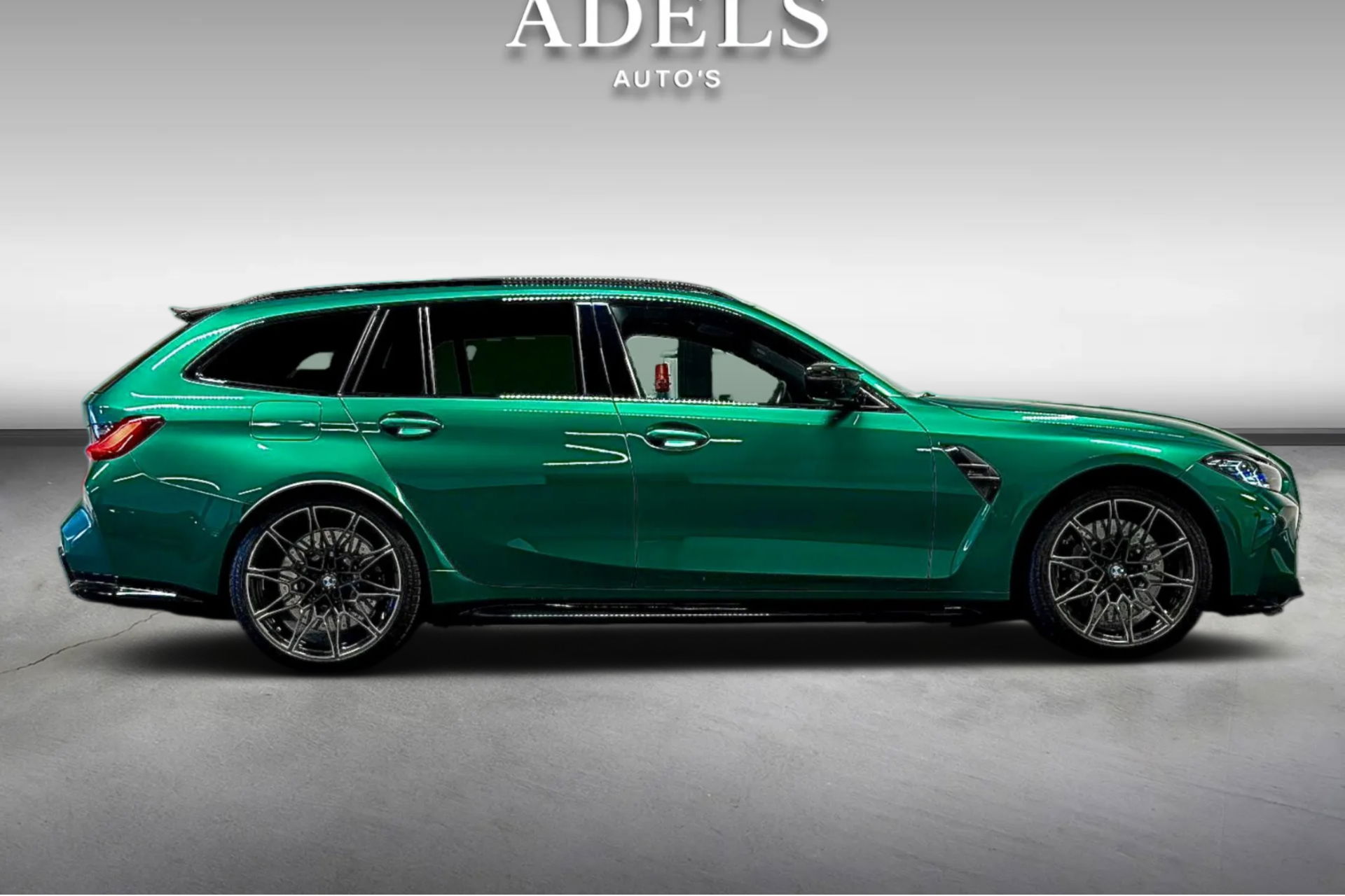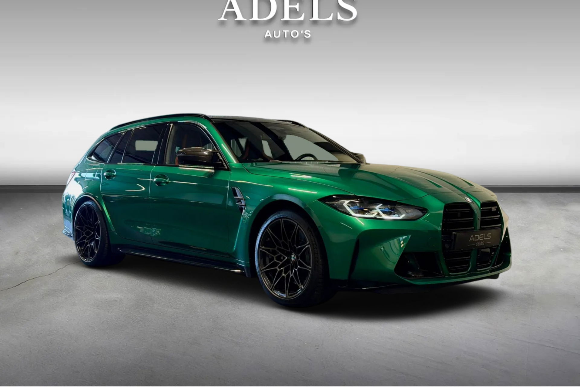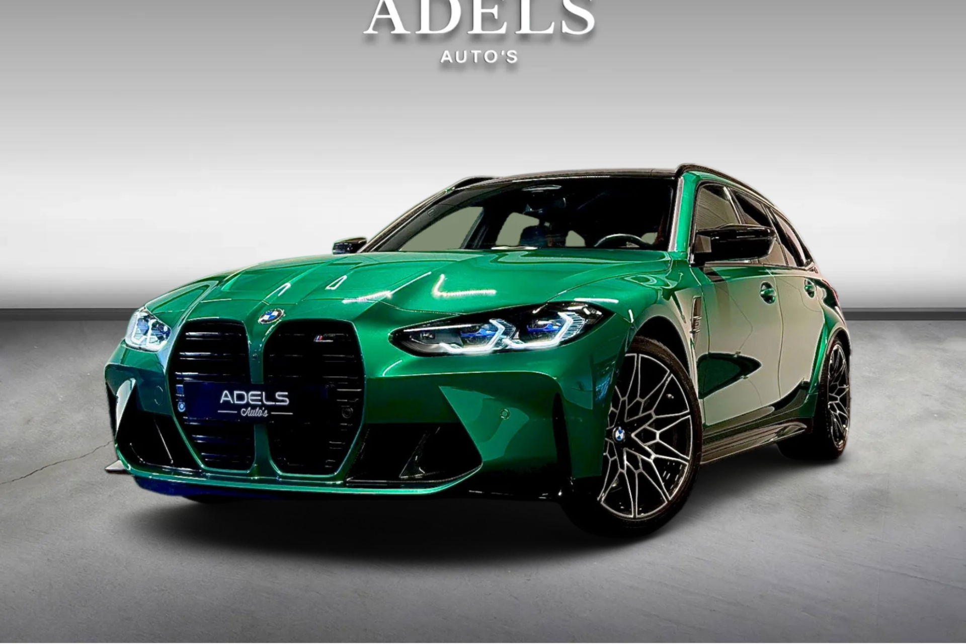 Wat een exemplaar! Deze BMW M3 Touring is uitgevoerd in Isle of Man Green Metallic in combinatie met het lederen interieur Fijnnappa Merino Kyalami oranje zwart met M Logo’s verlicht.