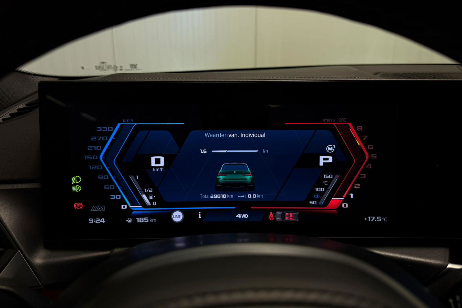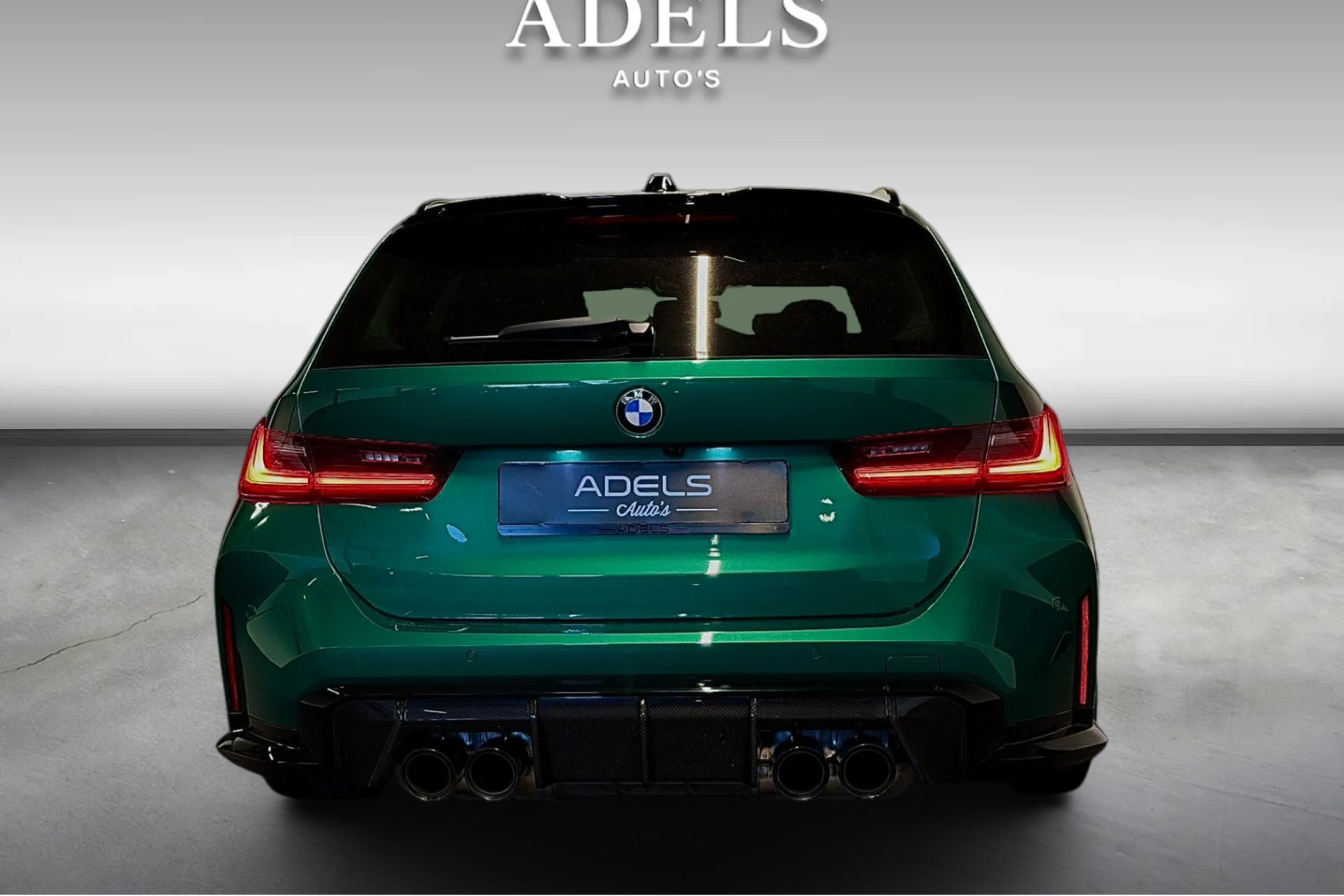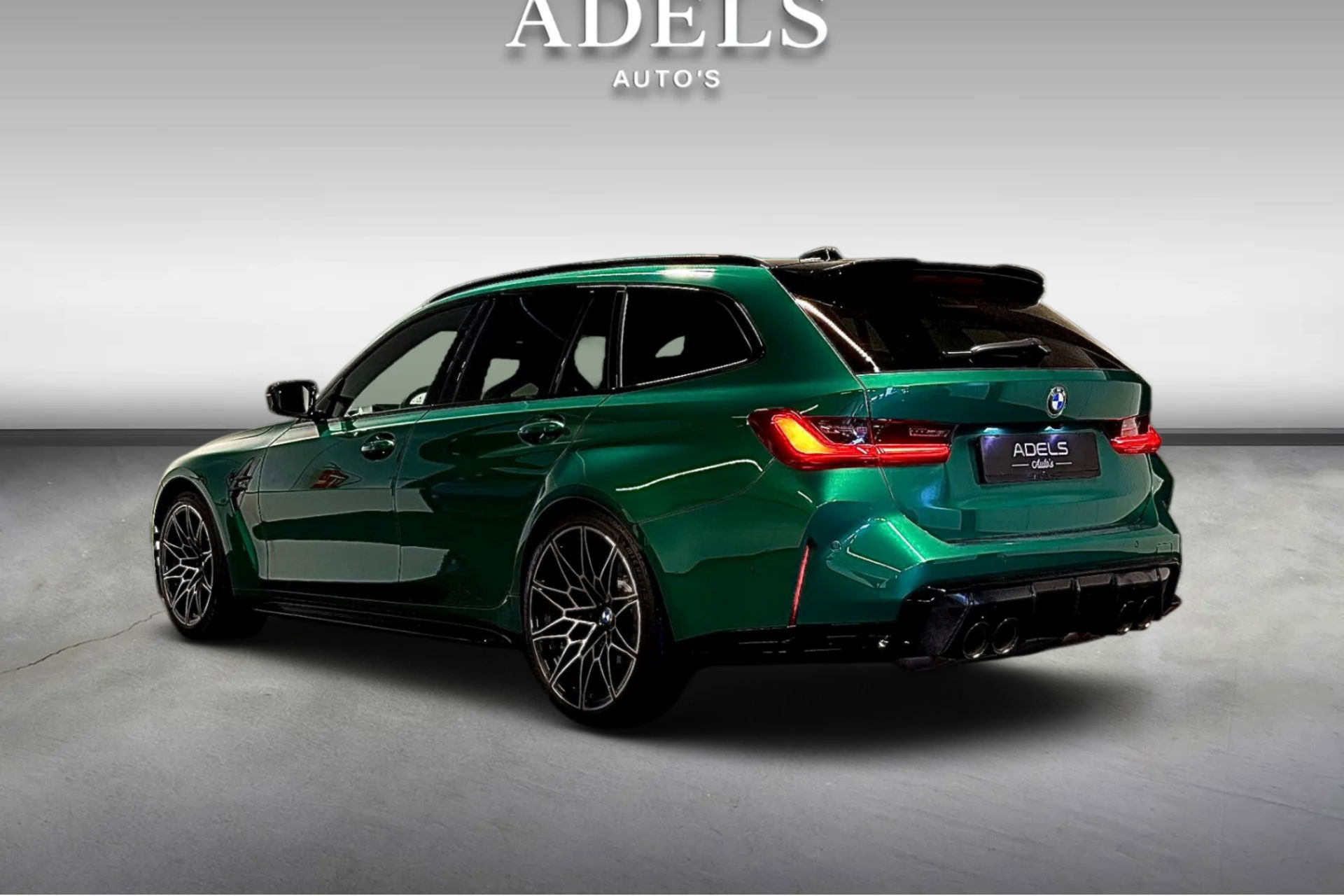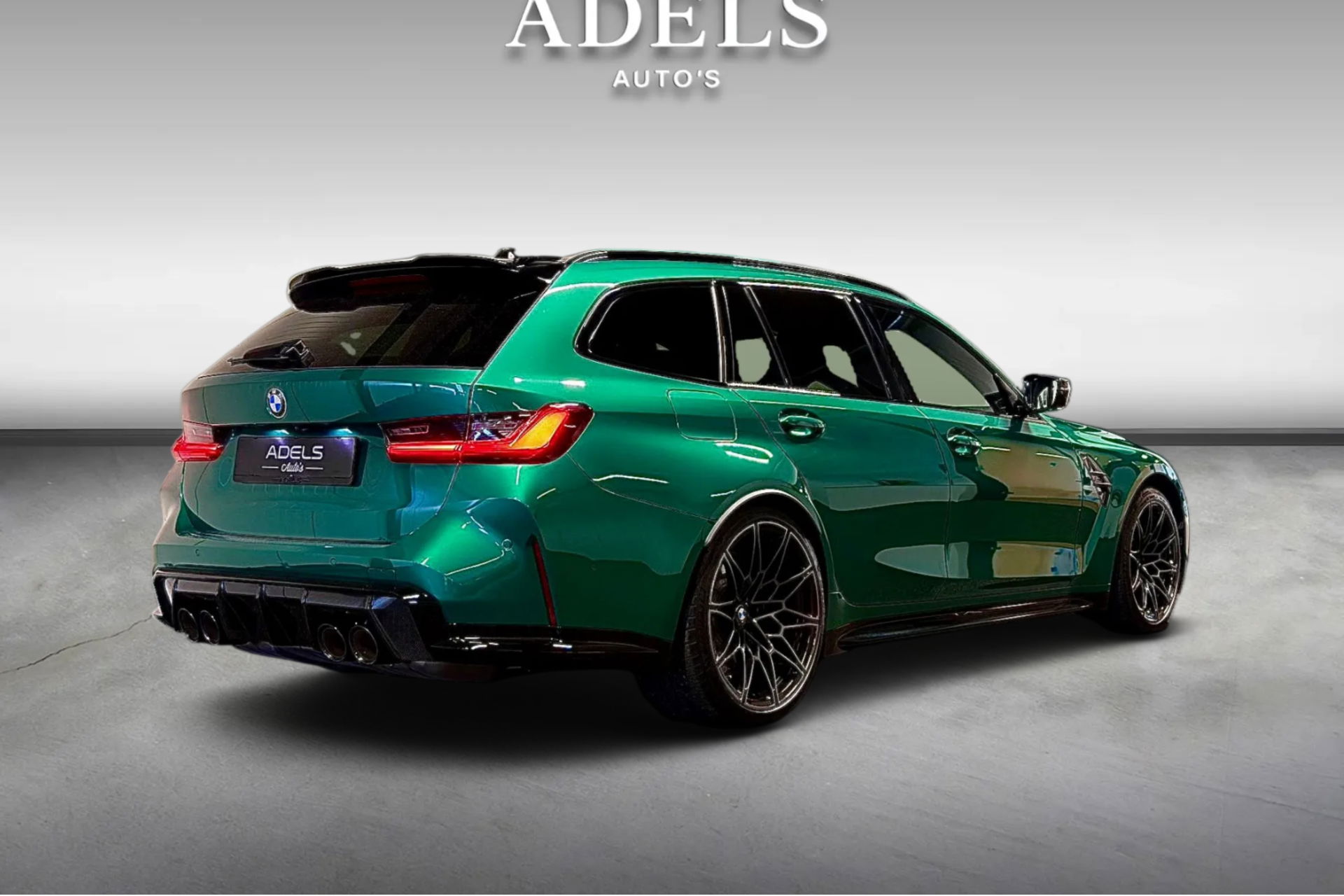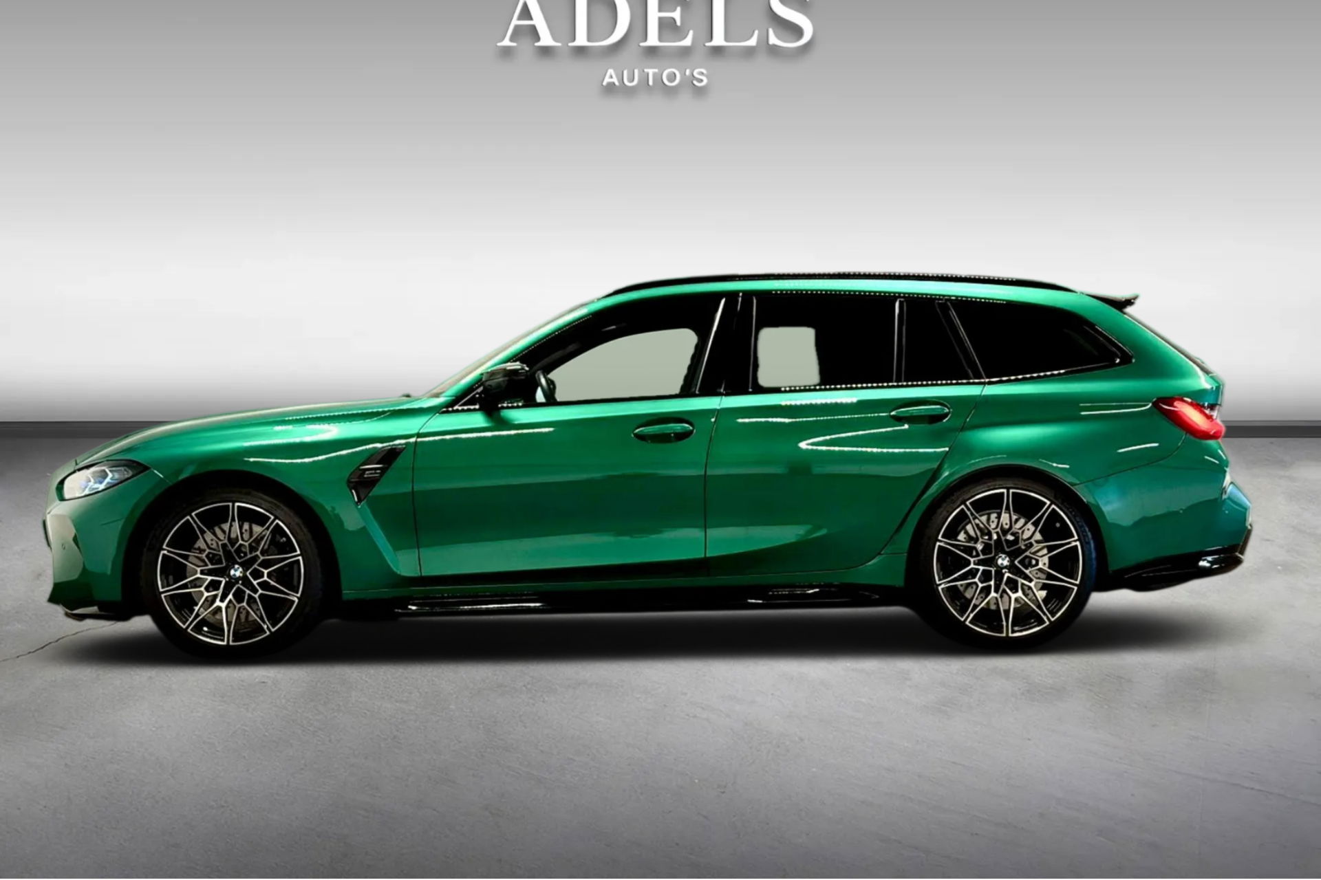 Wat een exemplaar! Deze BMW M3 Touring is uitgevoerd in Isle of Man Green Metallic in combinatie met het lederen interieur Fijnnappa Merino Kyalami oranje zwart met M Logo’s verlicht.