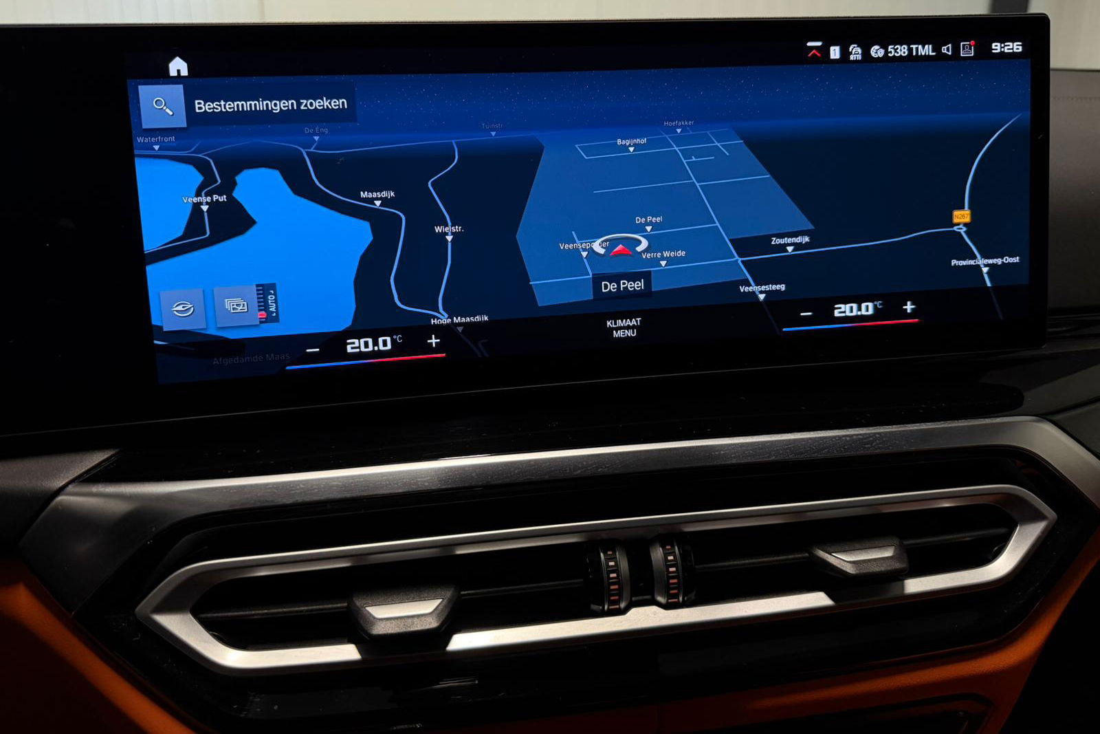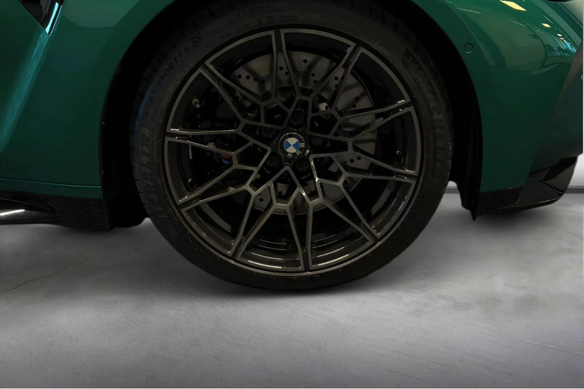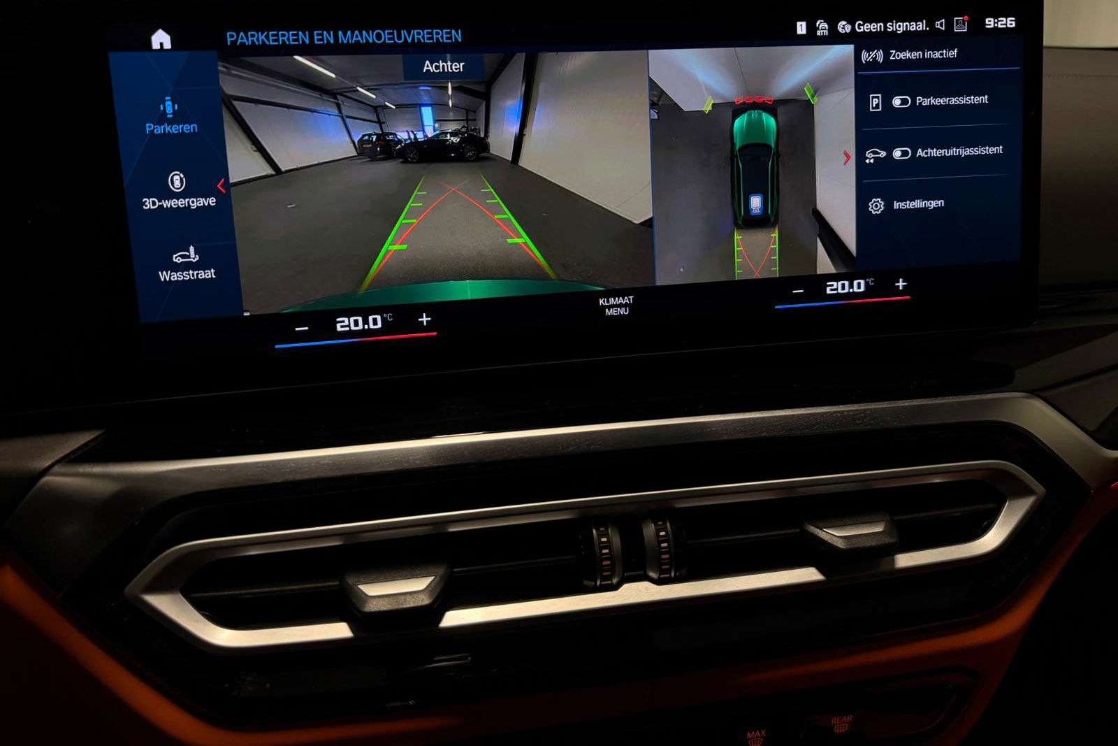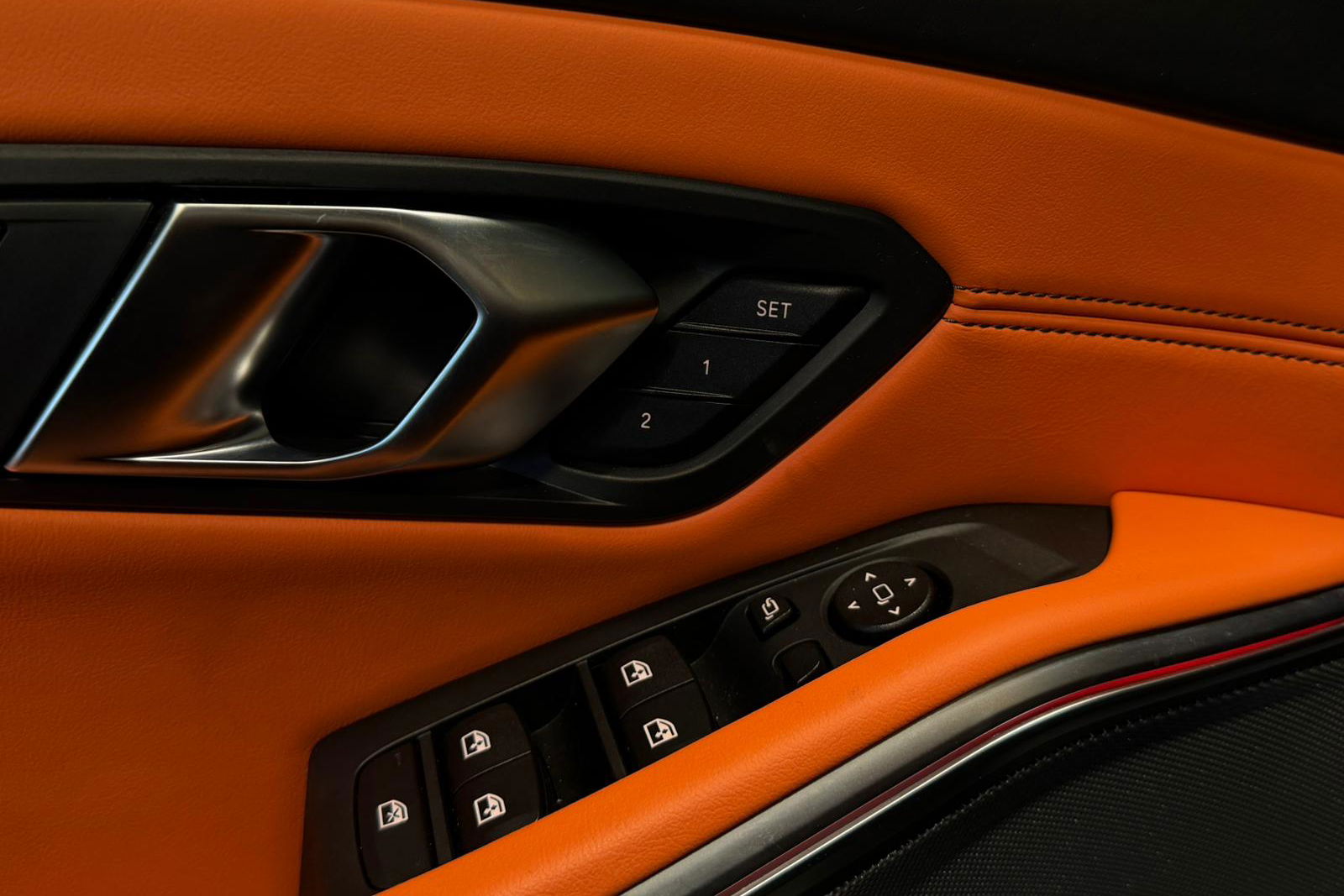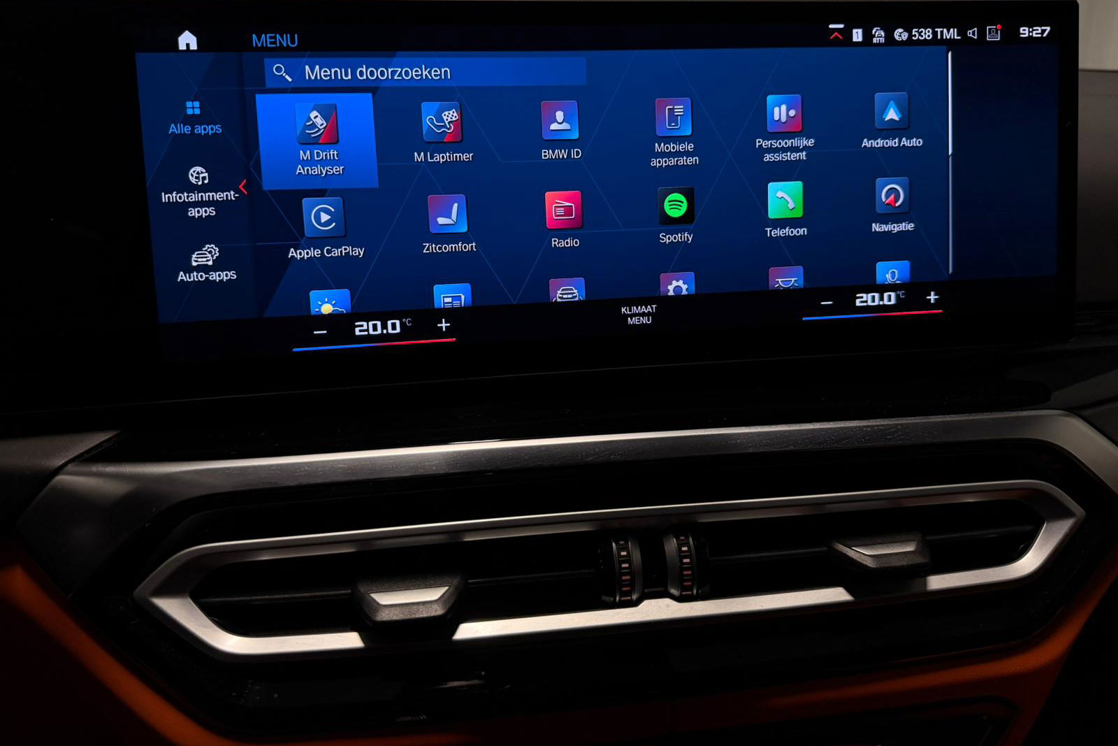 Wat een exemplaar! Deze BMW M3 Touring is uitgevoerd in Isle of Man Green Metallic in combinatie met het lederen interieur Fijnnappa Merino Kyalami oranje zwart met M Logo’s verlicht.